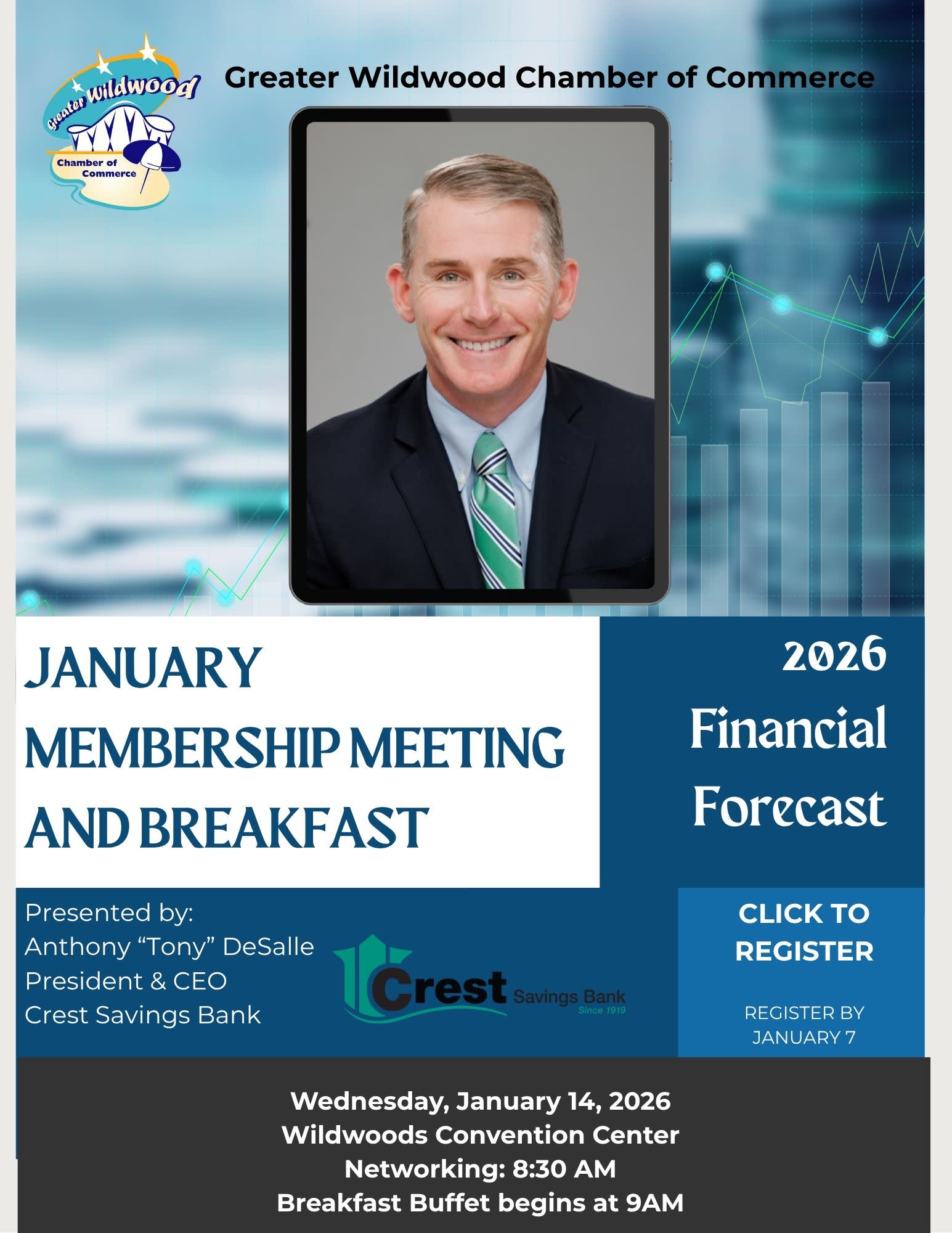 Presented By: Crest Savings Bank President & CEO Mr. Anthony "Tony" DeSalle You're invited to join us for breakfast for the Annual Financial Forecast. We hope you and a friend will join us for a networking opportunity and an informative presentation.