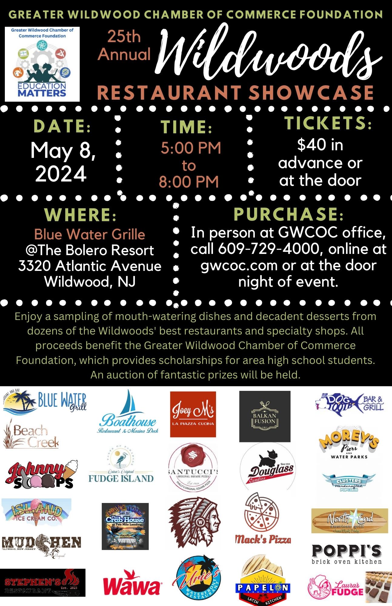 Enjoy a sampling of mouth-watering dishes and decadent desserts from dozens of the Wildwoods' best restaurants and specialty shops. All proceeds benefit the Greater Wildwood Chamber of Commerce Foundation, which provides scholarships for area high school students. An auction of fantastic prizes will be held.Images