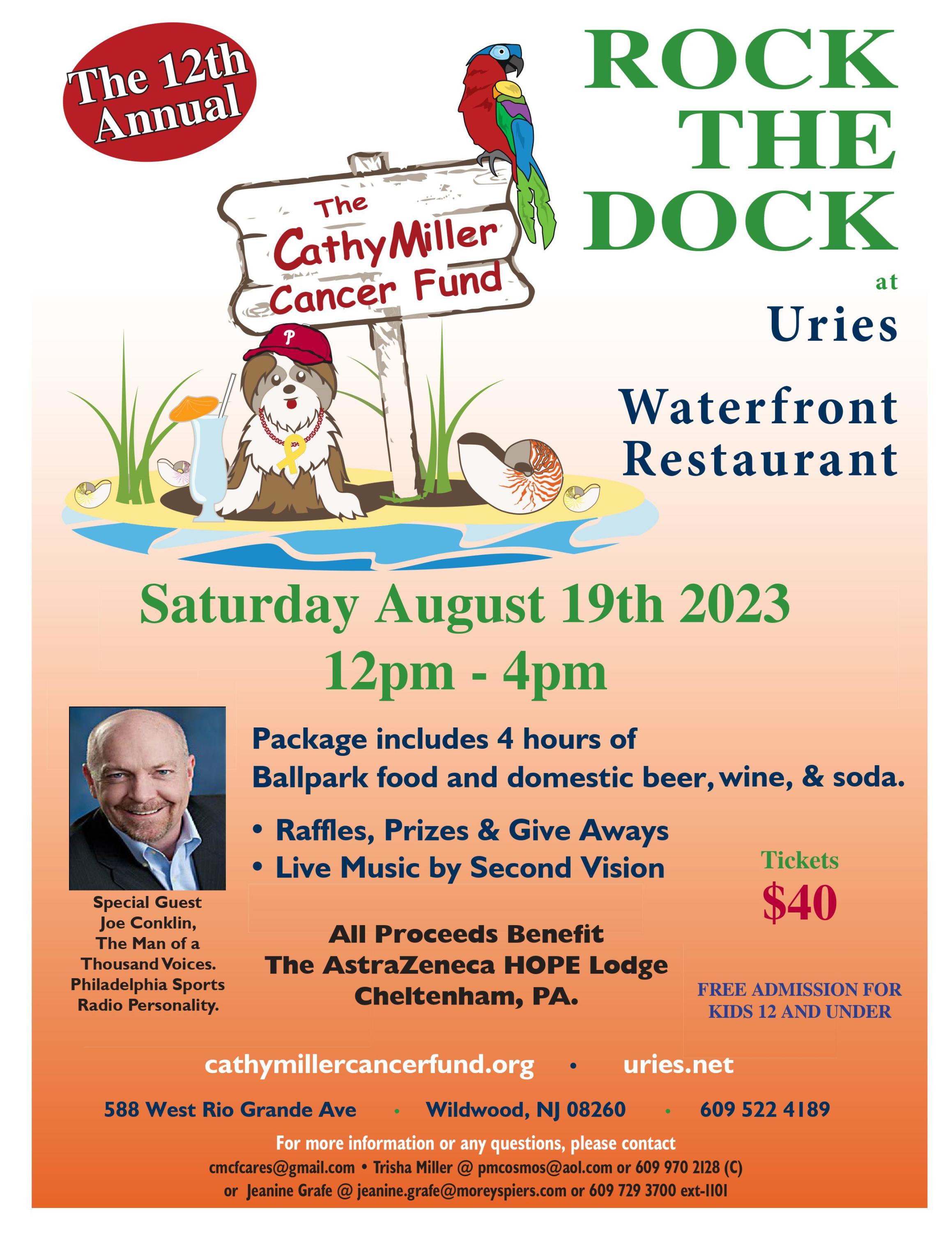 Support The Cathy Miller Cancer Fund at their 12th Annual ROCK THE DOCK event, held at Urie's Waterfront Restaurant. Tickets are $40. Package includes 4 hours of Ballpark food and domestic beer, wine and soda. Free admission for kids 12 and under. Live music by Second Vision. Raffles, Prizes & Give Aways. Special guest: Philadelphia sports personality Joe Conklin, The Man of a Thousand Voices. For tickets or more information, please call 609-706-4254 or visit www.cathymillercancerfund.org.