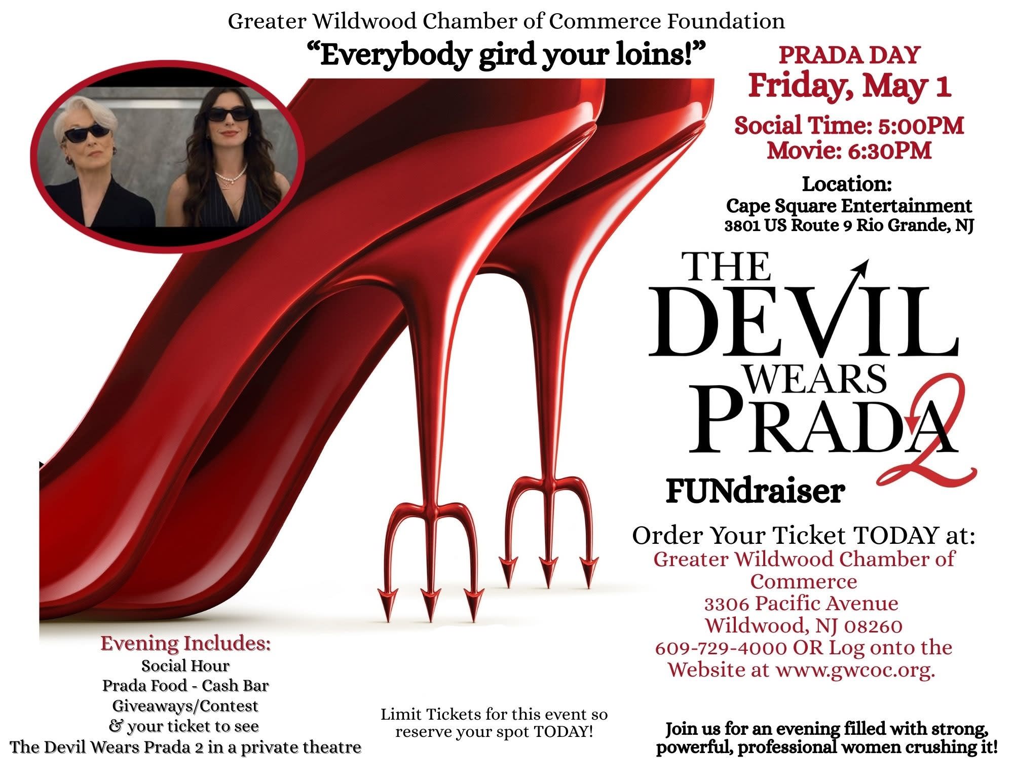 Join us for an evening filled with strong, powerful women crushing it! The evening includes viewing The Devil Wears Prada 2 in a private theater. There will be Prada food, cash bar, giveaways, and contests. Tickets are $47 (includes the credit card processing fee). Tickets will be picked up at the door the night of the event. This event benefits the Greater Wildwood Chamber of Commerce Foundation which gives scholarships to students of the Wildwoods.